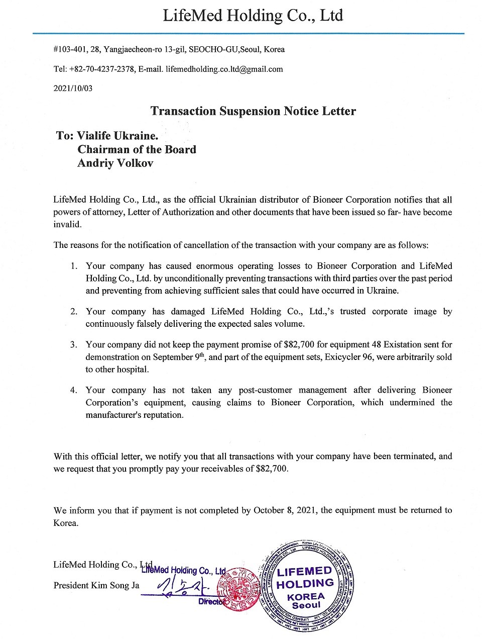 Також, як стверджують поінформовані джерела нашого видання, компанія "Віалайф Україна" втратила авторизацію через значні фінансові та репутаційні збитки, завдані корейській стороні. Незважаючи на це, родина Волкових вирішила завести ТОВ "Ексампла" як учасника державних тендерів, продовжуючи завдавати фінансових збитків медичним державним установам України. Оскільки, як стверджують джерела, компанія "Віалайф Україна та ТОВ "Ексампла" від її імені продовжують надавати на "ПРОЗОРРО" старі документи про авторизацію, що втратили свою дію.