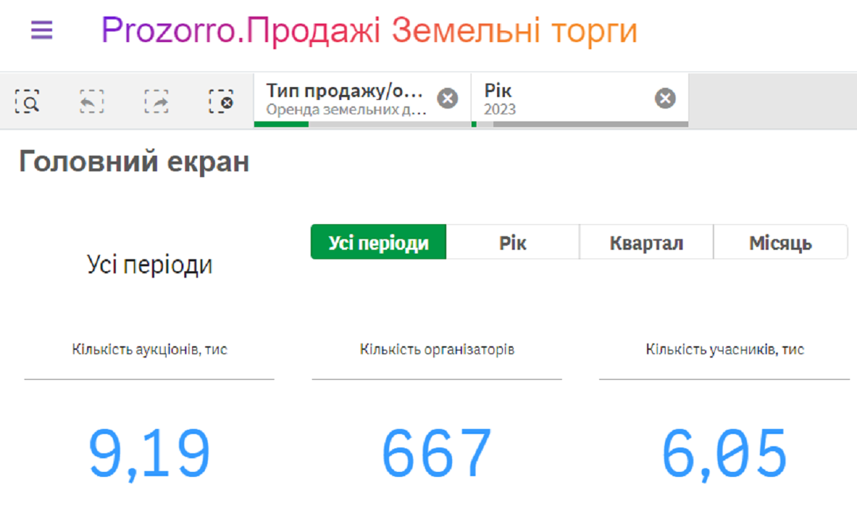 Так, станом на 19 грудня протягом 2023 року 667 ОТГ з різних куточків країни організували 9,19 тис відповідних торгів. Відповідно до модуля аналітики - ефективність торгів є низькою. Всього на відповідні аукціони прийшло 6,05 тис їх учасників, тобто в середньому на один аукціон приходить менше 1 учасника. Отже, якщо брати в масштабах всієї України, то земельні торги проходять в цілому без конкуренції, тобто із втратами для бюджетів.