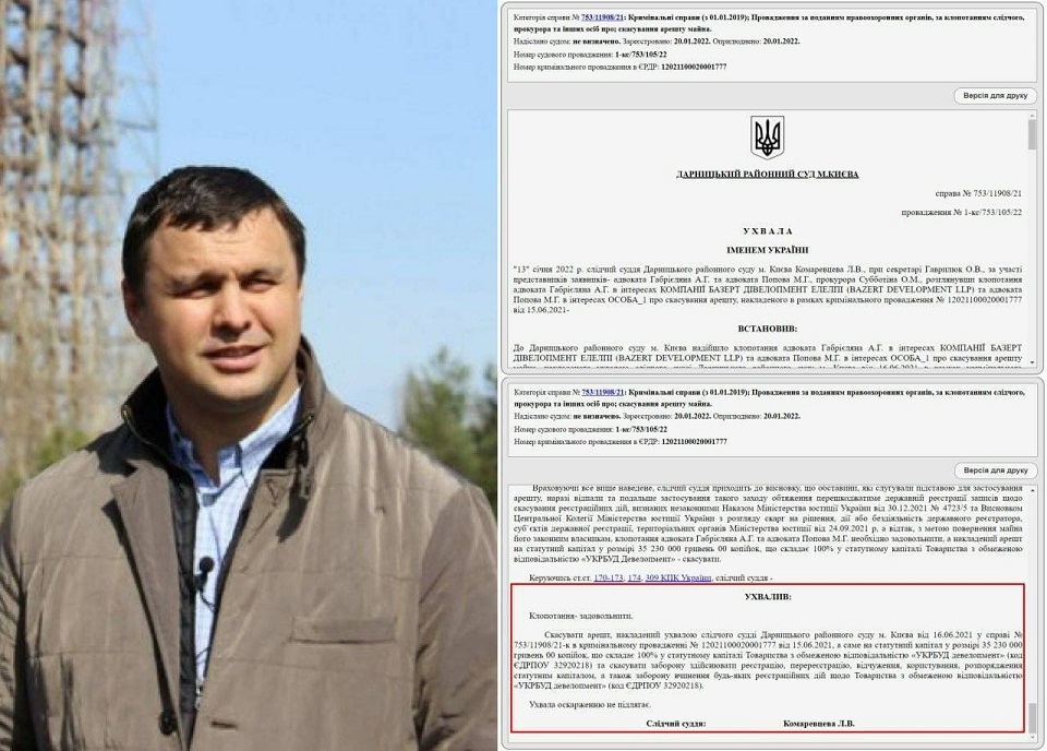 Відповідно до наказу Мінюста від 30 грудня 2021 та висновку Центральної колегії Мінюста з розгляду скарг було скасовано реєстраційні дії від 15 червня 2021, внаслідок яких Ільченко набув у власність корпоративні права ТОВ "Укрбуд Девелопмент". Але подальші дії Мін"юсту щодо відновлення прав Микитася як власника блокувалися ухвалою суду про арешт компанії. Дарницький суд дослідив обставини справи і переконався, що підстави для арешту відпали і його скасовано.