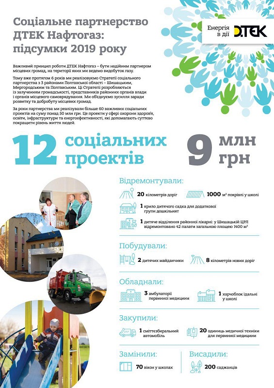 Серед проектів, які були реалізовані в 2019 році: ремонт понад 20 км доріг, облаштування трьох амбулаторій первинної медицини та придбання медичного обладнання, ремонт дитячого відділення Шишацької районної лікарні на 42 палати, ремонт дитячого садка, заміна 70 вікон в школах, закупівля сміттєзбирального автомобіля і т.д. Соціальні проекти компанії допомогли поліпшити життя більш ніж 25 тисячам жителів в Полтавській області.