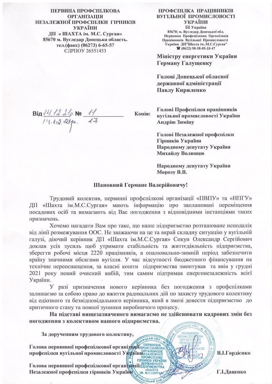 Трудовий колектив та профспілкові організації державного підприємства "Шахта ім. М.С. Сургая" оприлюднили листа до міністра енергетики Германа Галущенко. В ньому шахтарі вимагають не здійснювати кадрових змін на шахті без погодження з її працівниками. За інформацією колективу шахти, таке рішення обговорюється в Міненерго.