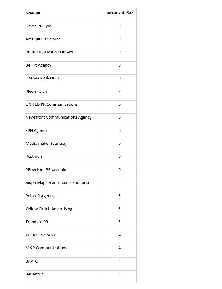 Топове медіа про комунікації та маркетинг MMR представляє Рейтинг PR агенцій України. Процес рейтингування тривав декілька місяців, на першому етапі агенції заповнювали анкети номінантів і проходили оцінку на технічну відповідність умовам конкурсу. Всього в голосування взяла участь 21 PR агенція.