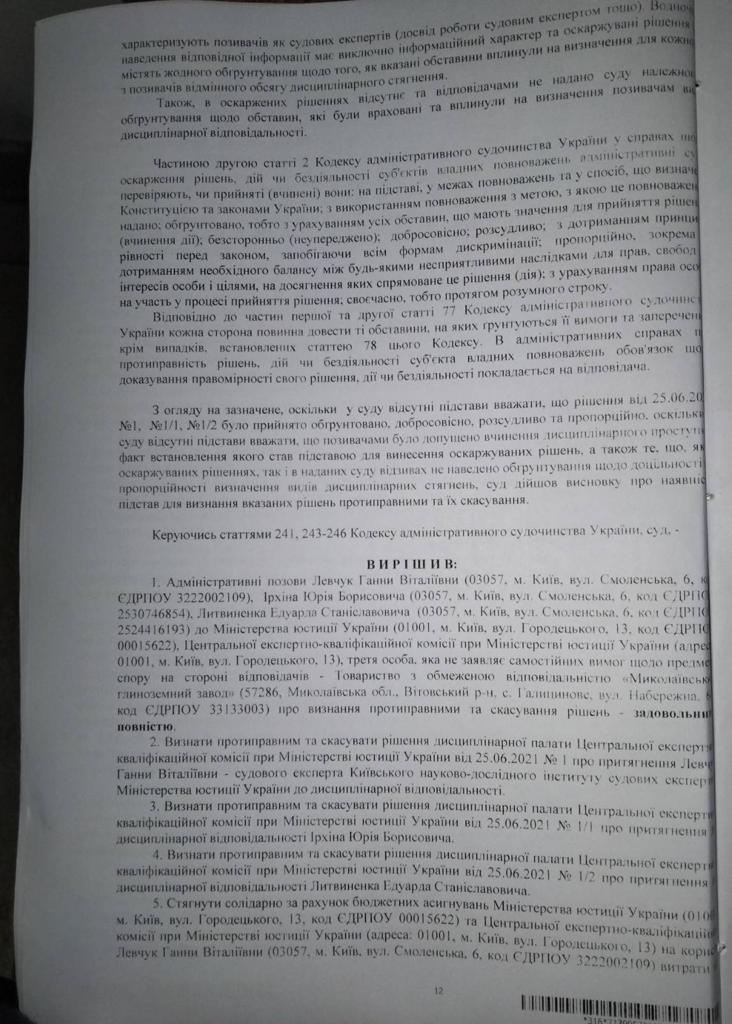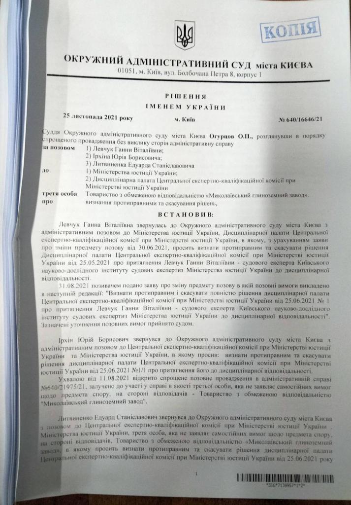Окружний адміністративний суд Києва визнав незаконним та скасував рішення дисциплінарної палати Центральної експертно-кваліфікаційної комісії при Мін'юсті про зупинення ліцензій експертів Юрія Ірхіна, Анни Левчук та Едуарда Литвиненка.
