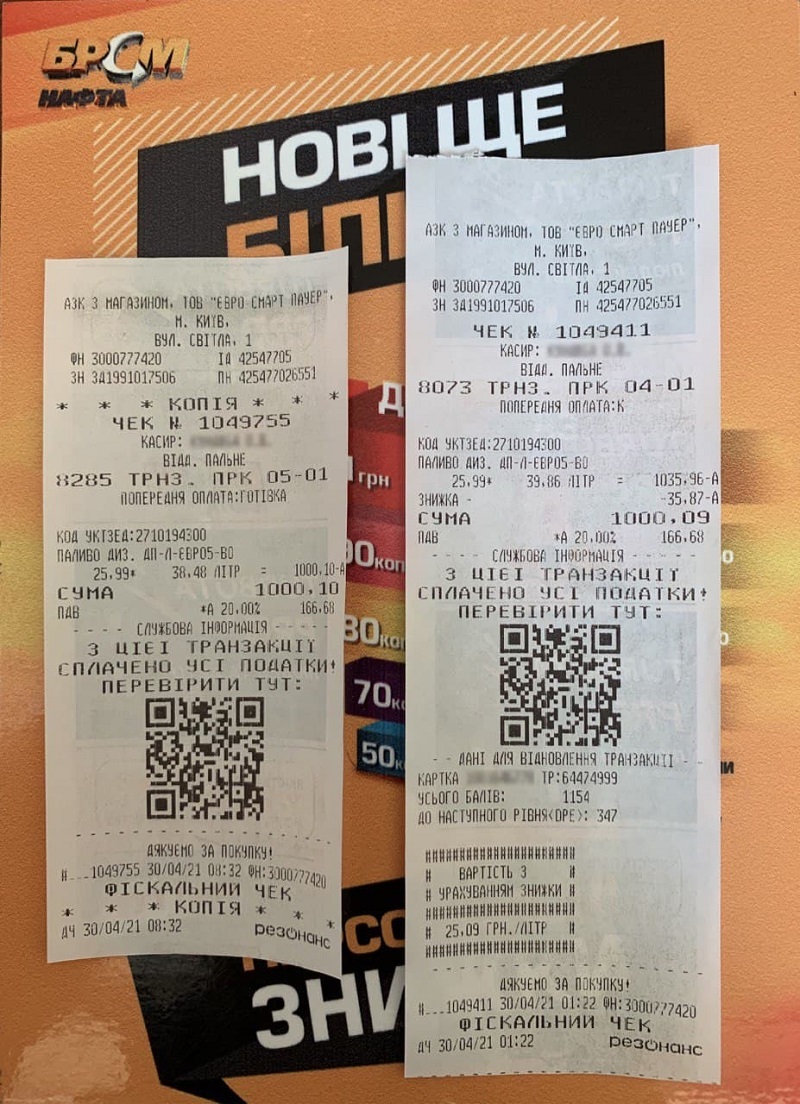Такі чеки видаються на всіх автозаправних комплексах "БРСМ-Нафти" кожному клієнту після будь-якої транзакції. Відсканувавши код, можна перевірити, чи є чек в базі Державної податкової служби.