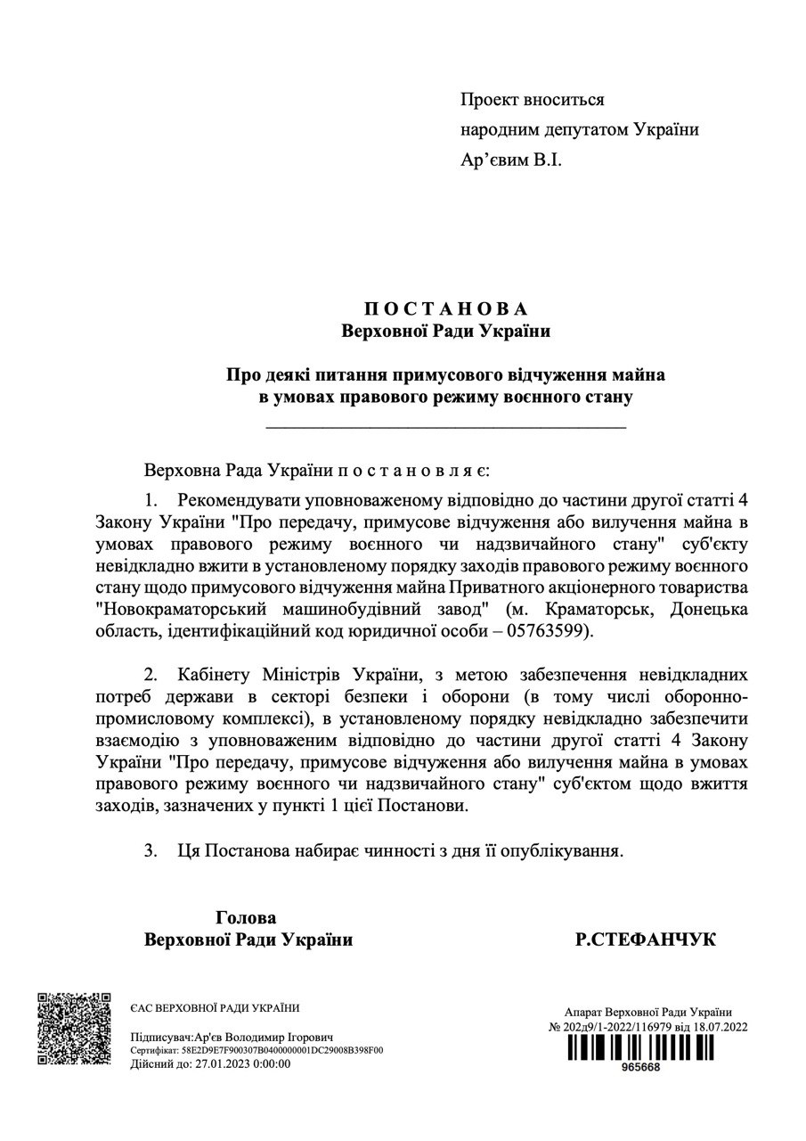 Держава з метою недопущення попадання до рук агресора машинобудівного обладнання, яке може бути використане для виробництва продукції військового призначення, націоналізувала НКМЗ. Завод буде вивезений - так пояснив у пояснювальній записці для ВР автор постанови депутат Ар'єв.