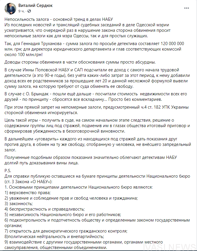 При цьому, за словами експерта, доводи сторони звинувачення в частині обґрунтування сум абсурдні: "У разі Інни Поповської НАБУ і САП підрахували її дохід з самого початку трудової діяльності (а це 90-ті роки) без урахування будь-яких витрат за цей період. до нього додали дохід всіх її родичів за минулі років 20 і за допомогою даної нескладної формули вивели суму застави на яку вимагають від суду обміняти її свободу. у випадку з Олегом Бриндаком порахували вартість нерухомості всіх його друзів за принципом "скинуться всы в складчину". Просто без коментарів".