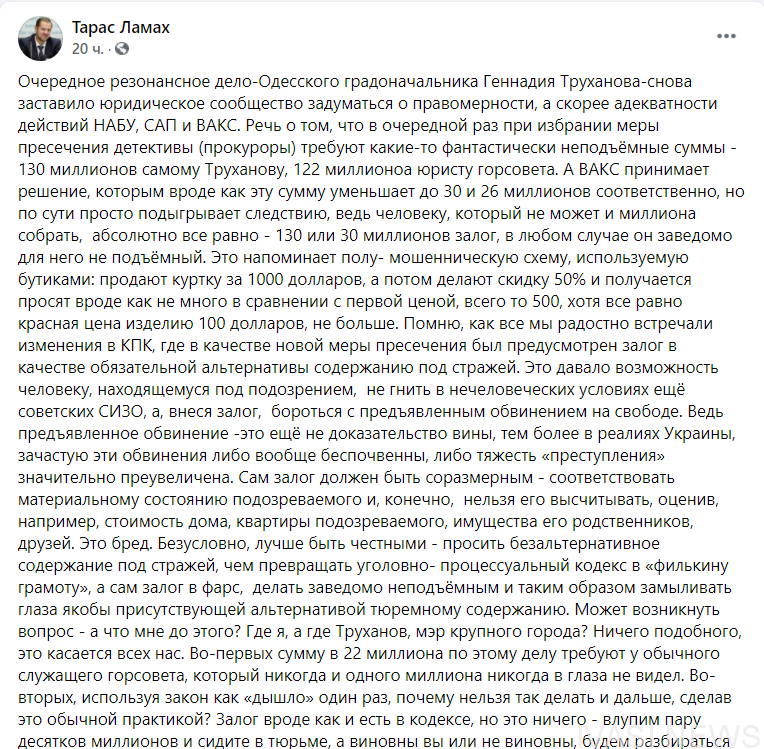 "Використовуючи закон як "дишло" один раз, чому не можна так робити і далі, зробивши це звичайною практикою? Застава ніби як і є в кодексі, але це нічого - влупив пару десятків мільйонів і сидіть у в тюрмі, а винні ви чи не винні, будемо розбиратися пару-трійку років", - пише Тарас Ламах.