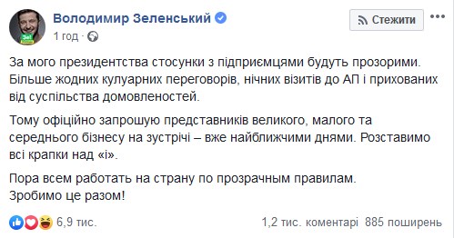 "За мого президентства стосунки з підприємцями будуть прозорими. Більше жодних кулуарних переговорів, нічних візитів до АП і прихованих від суспільства домовленостей", - написав він.