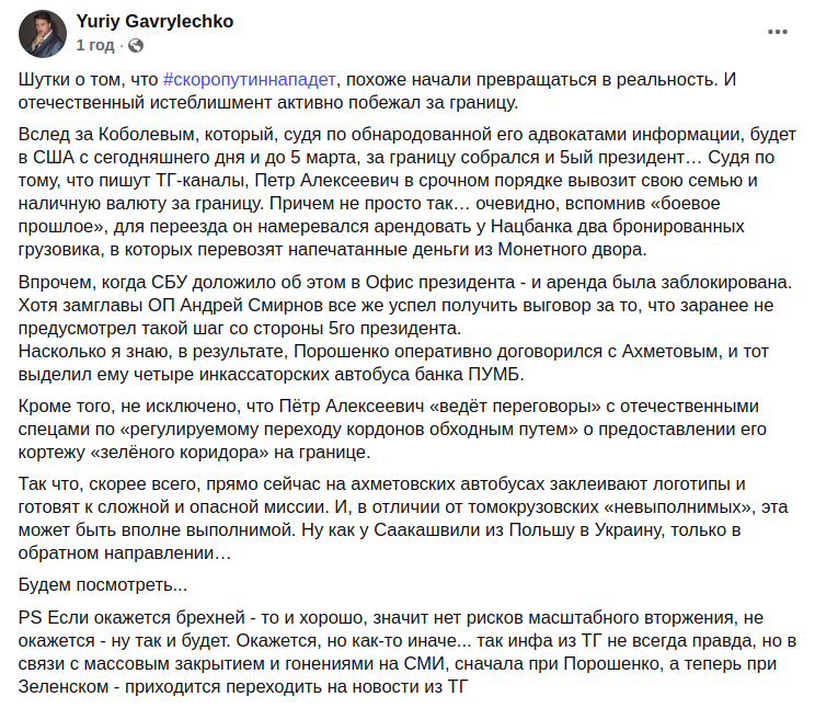 "Петро Олексійович терміново вивозить свою сім'ю та готівкову валюту за кордон. Причому не просто так… очевидно, згадавши "бойове минуле", для переїзду він мав намір орендувати у Нацбанку дві броньовані вантажівки, в яких перевозять надруковані гроші з Монетного двору", – розповів він.