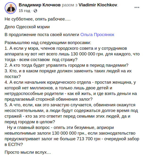 "Якщо начальник юридичного відділу - проста жінка, у якої немає мільйонів, а лише двоє дітей і непрацездатні батьки - як їй жити, і де взяти гроші на пропоновану стороною обвинувачення заставу?", - написав Клочков.