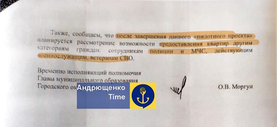 "Проте навіть це - ще не кінець. Після закінчення цього "пілотного проєкту" почнуть за подібним алгоритмом розселення "ветеранів та учасників СВО" Що означає, що купа зброду з далеких регіонів росії перевезе свої сім"ї (або самі родини вже "хороших русских") понаїдуть в наші квартири. Та навіть тут замало ставити точку. Тому що окрім квартир, росіянам роздадуть земельні ділянки в самих "жирних" місцях. Там, де красиво безпечно. Біля моря", - повідомив Андрющенко, опублікувавши відповідний "документ".