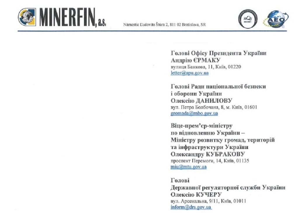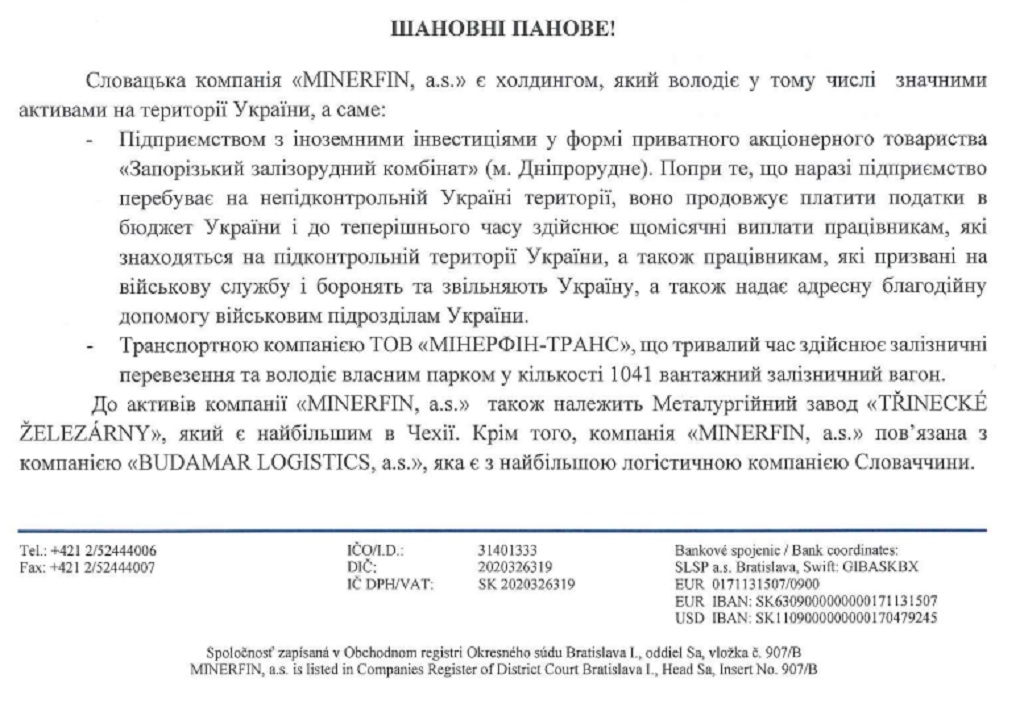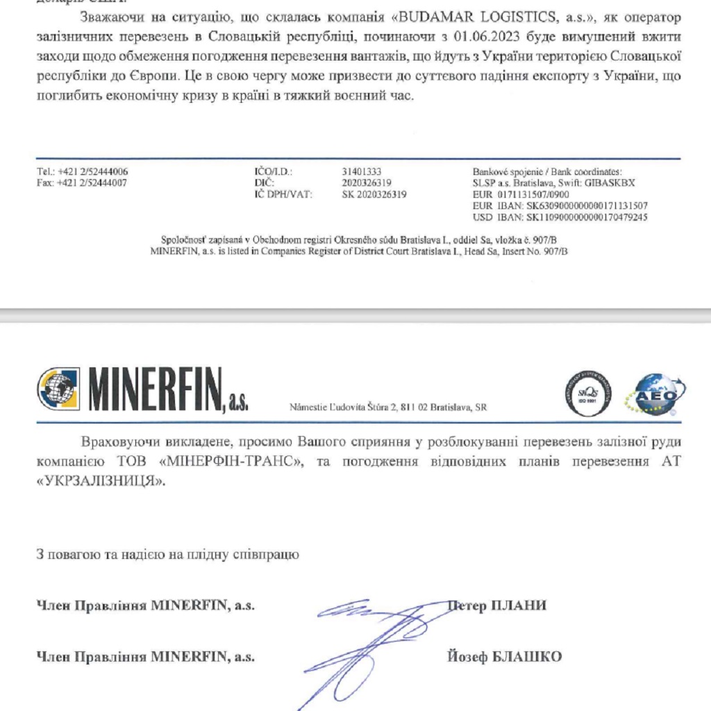 Дії залізничного монополіста, за твердженням "MINERFIN, a.s.", з 1 червня можуть ускладнити транзит українських товарів територією Словаччини аж до повного його припинення. Словацька компанія вказує, що володіє в Україні "Запорізьким залізорудним комбінатом" у Дніпрорудному, транспортною компанією з парком у 1041 вагон. До активів "MINERFIN, a.s." належить металургійний завод Třinecké Železárny, що є найбільшим у Чехії. За інформацією "MINERFIN, a.s.", чеське підприємство є покупцем залізної руди виробництва АТ "Криворізький залізорудний комбінат". Її доставка здійснювалася за умовами DAP Чоп, а територією Європи, зокрема Словацької республіки, перевезенням цієї продукції займалася компанія "Budamar logistics, a.s.".
