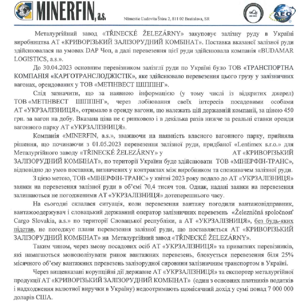 "Таким чином, через змову посадових осіб АТ "УКРЗАЛІЗНИЦЯ" та приватних перевізників, які намагаються монополізувати ринок вантажних перевезень, блокується 15% місячного об"єму перевезень залізної руди залізничним транспортом в Україні. Через ці дії АТ "Укрзалізниця" та експортер металургійної продукції АТ "Криворізький залізорудний комбінат" (один з основних платників податків і надходження валютної виручки в Україну) недоотримають щомісячного доходу понад 7 млн доларів США", - заявила "MINERFIN, a.s.".