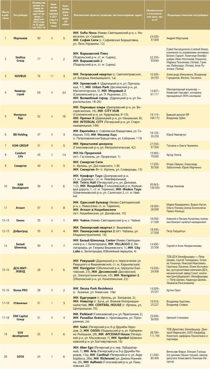 Загалом у рейтингу представлені 20 компаній-забудовників. Список складено за критерієм кількості житлових будинків, зданих девелоперами в експлуатацію на території Києва та Київської області за останні 8 років.