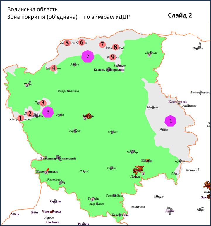На слайді 2 - ми об'єднали шість зон в одну загальну, вона позначена "зеленим" кольором. За вимірами Центру радіочастот в цій зоні є впевнений прийом сигналу мережі Т2. Поза прийому - три зони, пронумеровані 1, 2 і 3.
