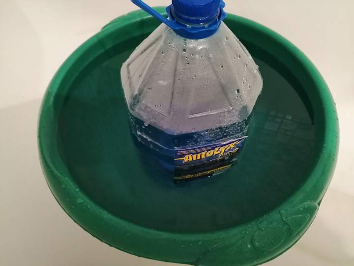 Підігрівайте омивайку в ємності з гарячою водою (гарячій бані). Забрати холодну рідину, щоб замінити її гарячою, можна за допомогою розпилювача та довгої трубки.