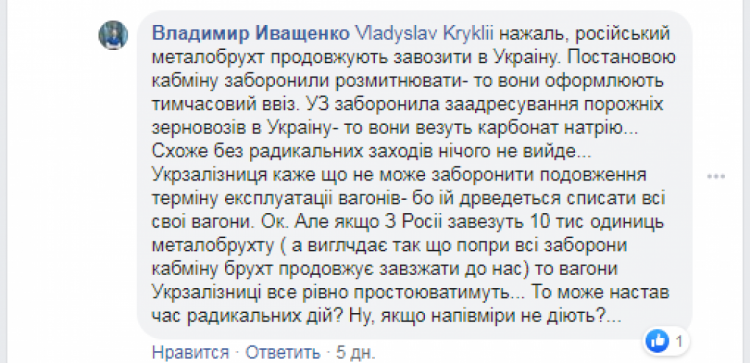 "Але якщо з Росії завезуть 10 тис одиниць металобрухту, то вагони "Укрзалізниці" будуть простоювати ... Може, прийшла пора радикальних дій?" - пише СЕО компанії "ТАС-Логістик" Володимир Іващенко міністру інфраструктури Владиславу Криклію в Facebook.