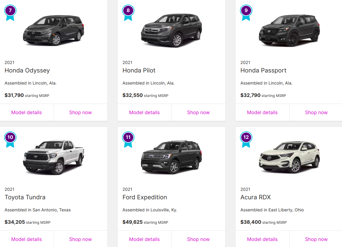 Сьома позиція дісталася мінівену Honda Odyssey, одразу за ним восьму і дев'яту позицію розділили автомобілі Honda Pilot і Honda Passport.