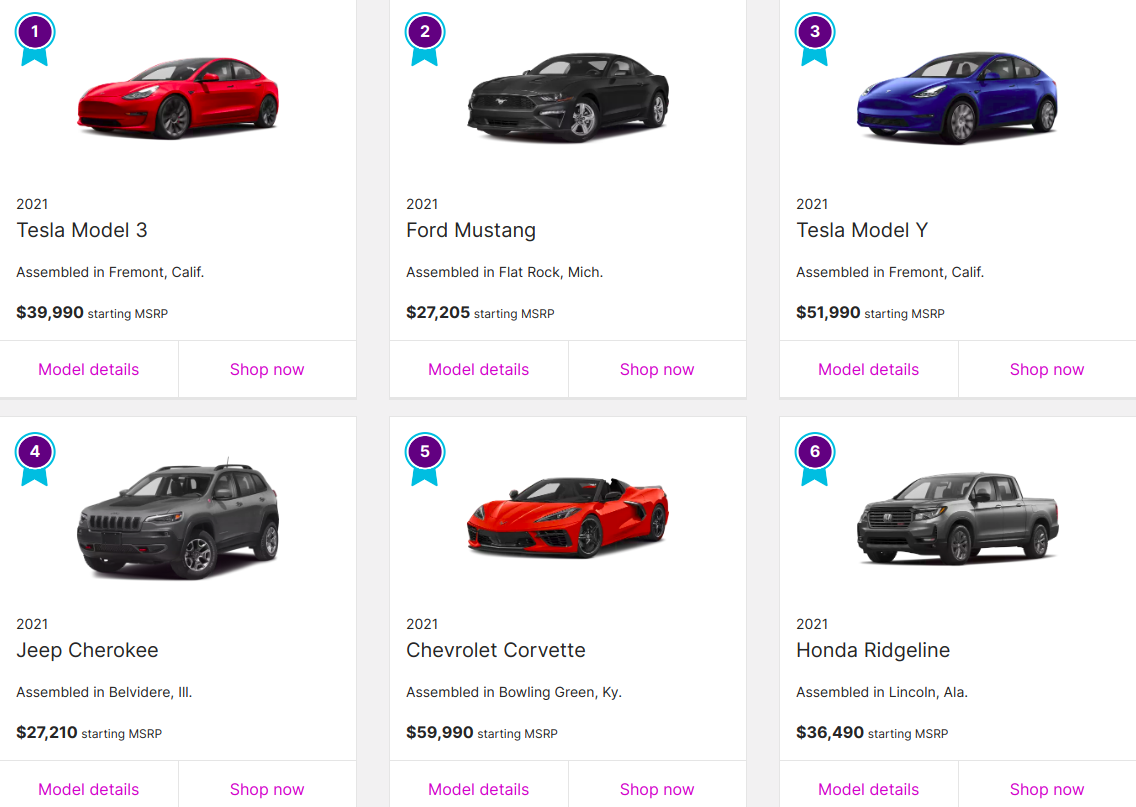 У рейтингу ТОП-12 найбажаніших автомобілів, серед жителів Америки, перше місце впевнено займає Tesla Model 3. На другому місці Ford Mustang. Трійку лідерів завершує Tesla Model Y.