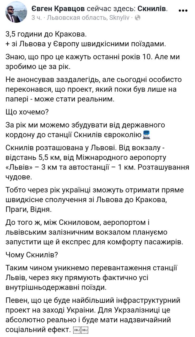 "3,5 години до Кракова. А ще - зі Львова у Європу швидкісними поїздами. Знаю, що про це кажуть останні років 10. Але ми зробимо це за рік", - написав Кравцов.