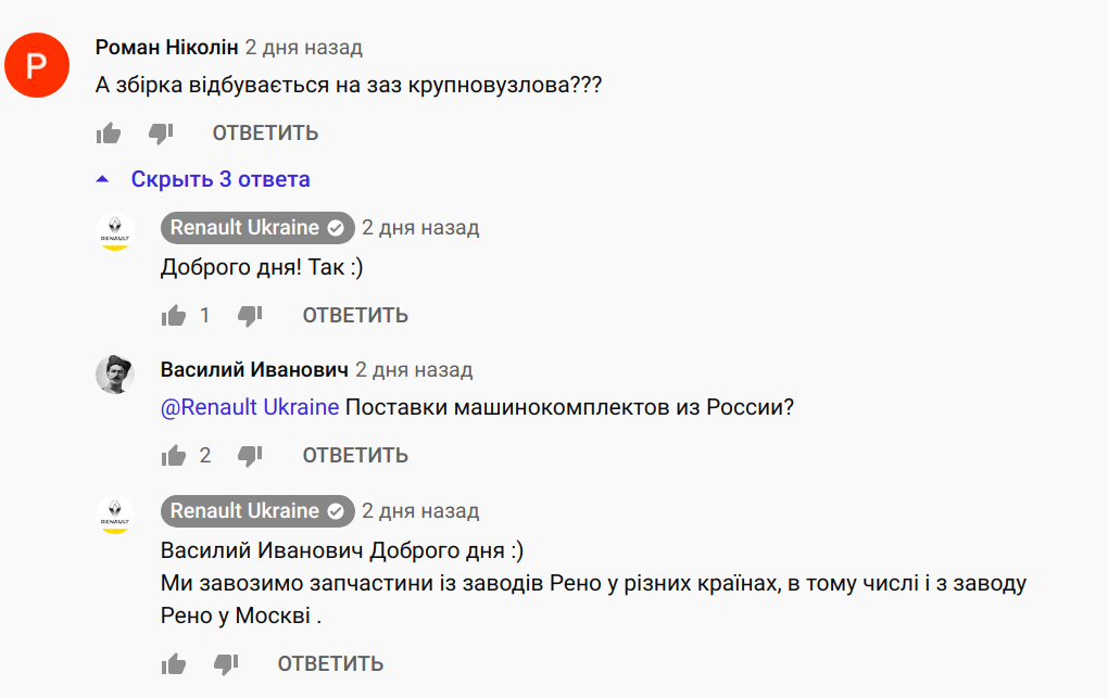 "Ми завозимо запчастини із заводів Рено у різних країнах, в тому числі і з заводу Рено у Москві", - йдеться у відповіді на питання одного з коментаторів про те, звідки постачають машинокомплекти.