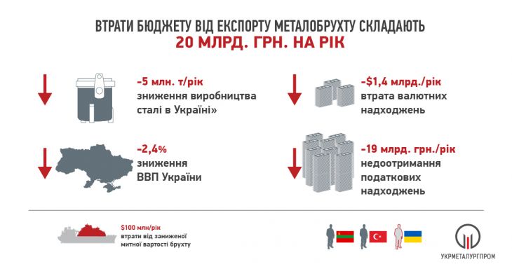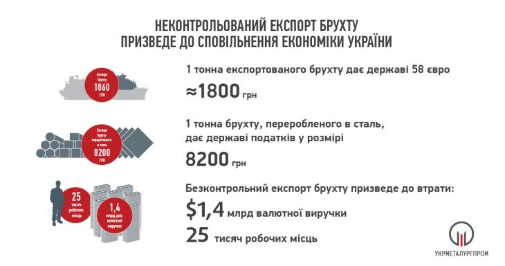 В "Укрметаллургпромі" стверджують, що 1 тонна експортованого брухту дає державі близько 1,8 тис грн (еквівалент мита в 58 євро), тоді як 1 тонна брухту, переробленого в сталь, приносить 8,2 тис. грн податків.
