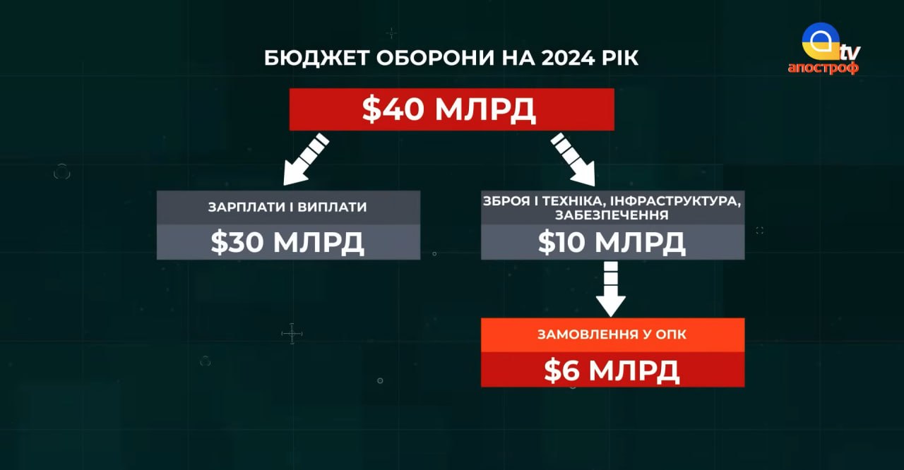 Ухвалений Верховною Радою 9 листопада 2023 Закон про держбюджет-2024 розподіляє 1,164 трлн грн (40 млрд дол), на безпекові потреби. $30 млрд йде на зарплати і виплати військовим, $10 млрд на підтримання і ремонт інфраструктури, закупівлю палива, форми та іншого забезпечення тощо. $6 млрд йде на закупівлю озброєння і військової техніки.