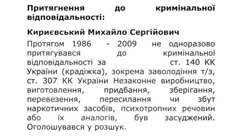 Політолог пише, що Кирієвський Михайло - фігурант кількох кримінальних справ… "за однією з них його звинувачували та визнали винним у незаконному провадженні, виготовленні, придбанні, зберіганні, перевезенні, пересиланні або збуті наркотичних засобів, психотропних речовин".