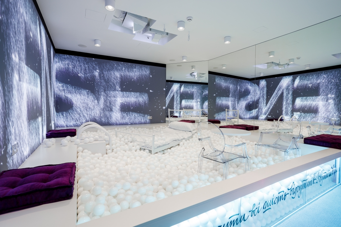 Раніше ця будівля була банківським офісом: залишився той же лабіринт коридорів, об"єднані переговорні та родзинка AHUB – приміщення старого сховища. Тепер це унікальна Sense Room: вона обладнана зручним м"яким ліжком, басейном з кульками, проєктором на дві стіни та потужною акустичною системою. Тобто усім необхідним, аби впливати одразу на шість чуттів людини. Та головна її особливість – це 1,5-тонні броньовані двері й стіни завтовшки в метр, завдяки чому в ній буквально можна ізолюватися від зовнішнього світу та повністю перезавантажитися (чи навіть поспати).