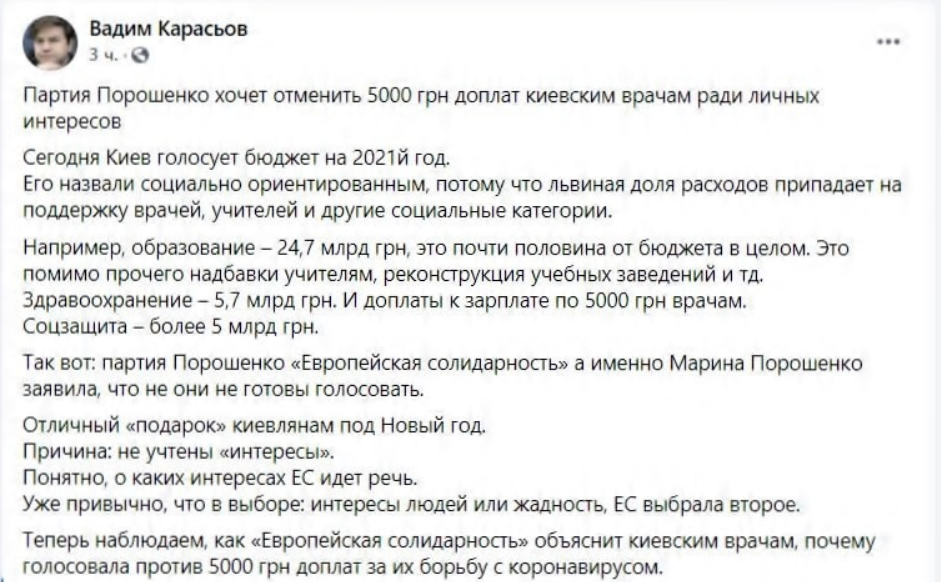 "Так ось: партія Порошенка "Європейська солідарність", а саме Марина Порошенко, заявила, що вони не готові голосувати. Відмінний "подарунок" киянам під Новий рік. Причина: не враховано "інтереси". Зрозуміло, про які інтереси "ЄС" йде мова. Вже звично, що у виборі: інтереси людей чи жадібність, "ЄС" вибрала друге. Тепер спостерігаємо, як "Європейська солідарність" пояснить київським лікарям, чому голосувала проти 5000 грн доплат за їх боротьбу з коронавірусом", - написав Карасьов.
