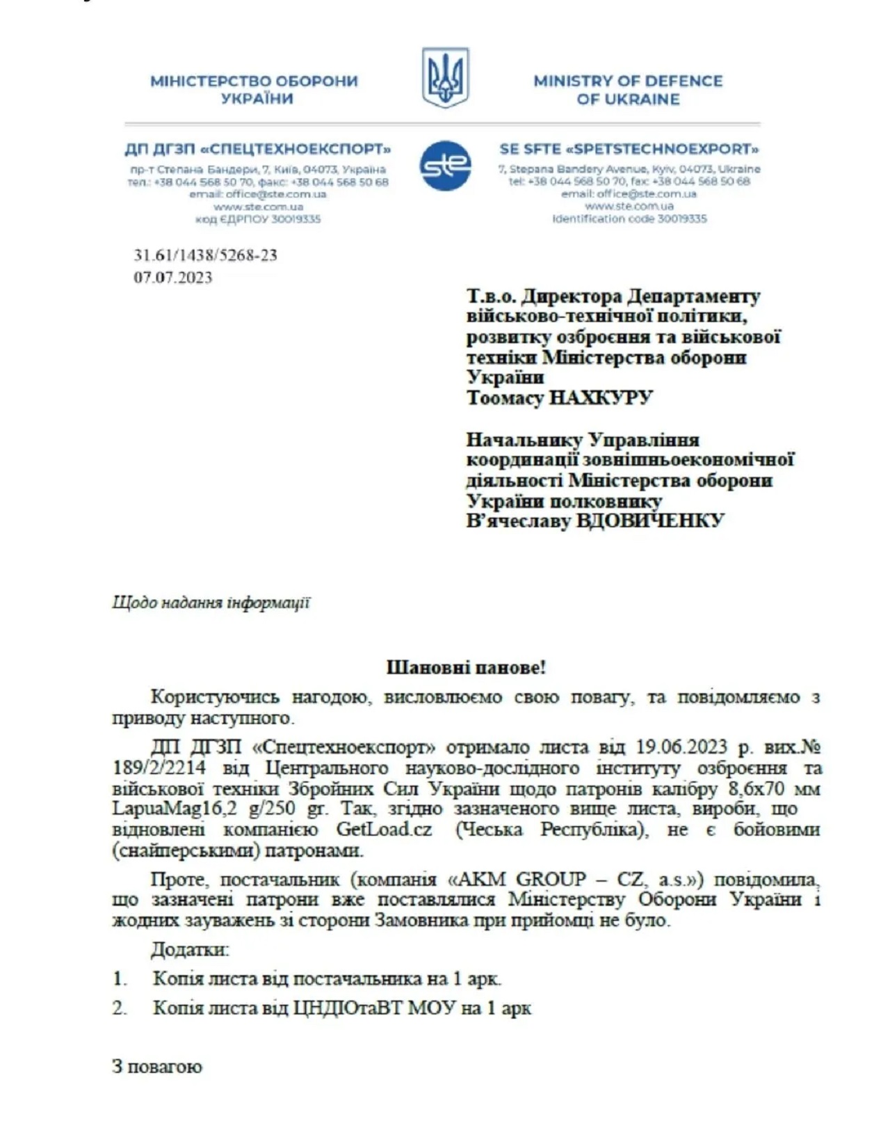 Проте "AKM-group CZ" активно весь 2023 рік продовжувала укладати контракти із Міністерством оборони та державними спецімпортерами. У червні 2023 державний спецімпортер ГУР "Спецтехноекспорт" звернувся на адресу Департаменту Міністерства оборони України із пропозицією здійснити постачання відновлених патронів калібру 8,6х70 мм виробництва (відновлення) компанії GetLoad.cz через "AKM-GROUP CZ".