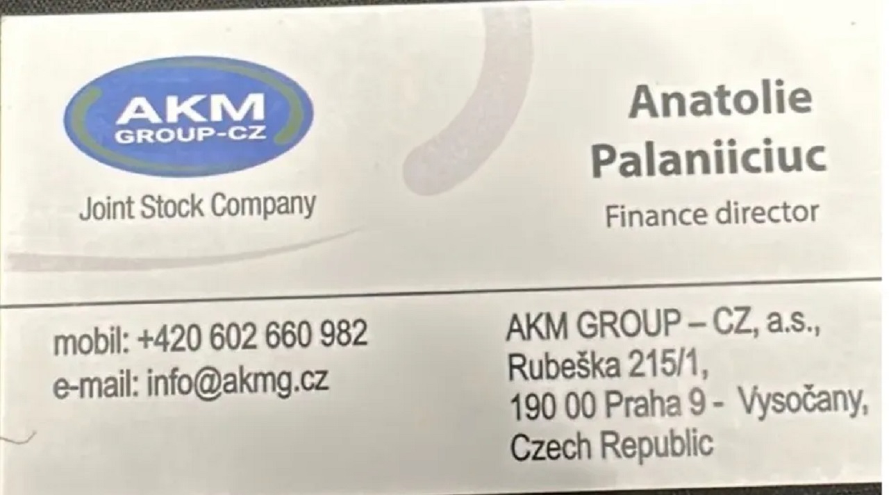 Лапін виклав візитну картку фінансового директора "AKM-group CZ" Анатолія Паланійчука – людина з таким ім'ям та прізвищем деякий час очолювала податкову інспекцію в Чернівцях та був керівником Федерації дзюдо у Чернівецькій області.