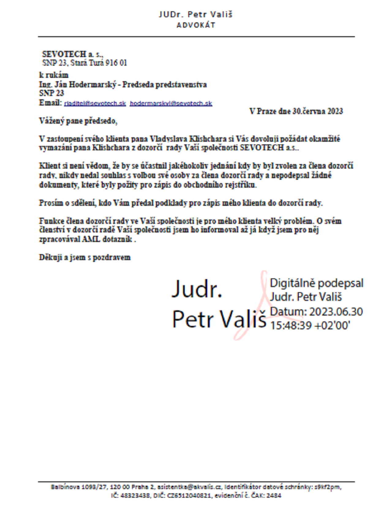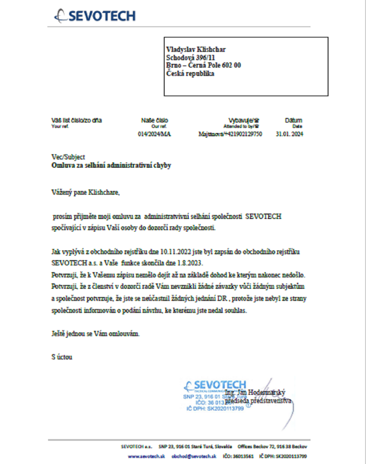 "Із цієї письмової комунікації випливає, що я ніколи не давав згоди на зарахування моєї особи до структури Sevotecha.s.", - вказав Кліщар.