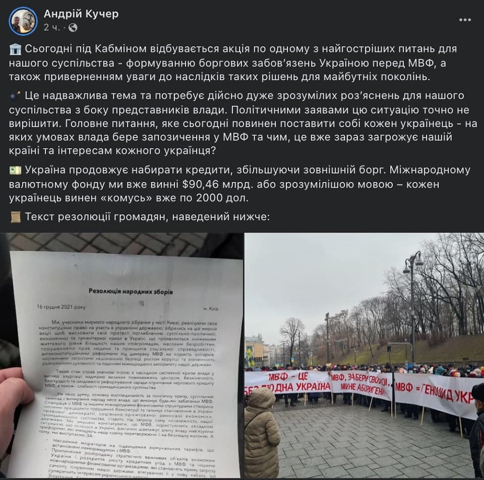 У четвер, 16 грудня, у центрі Києва відбулася акція протесту "МВФ – геноцид України", спрямована проти політики держави щодо роботи з Міжнародним валютним фондом (МВФ). Протестувальники вимагали від представників влади припинення співпраці України з МВФ.