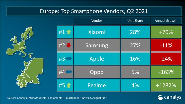 Xiaomi вперше посіла перше місце в Європі з часткою ринку 28%, в той час як поставки смартфонів зросли на 77% у порівнянні з минулим роком.