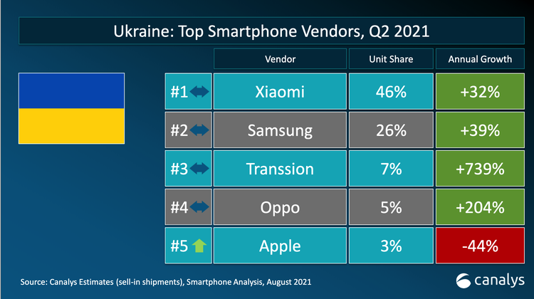За даними дослідників, у 2 кварталі 2021 Xiaomi продовжує очолювати український ринок смартфонів із часткою ринку 46% (проти 43% у 1 кварталі 2021) та річним зростанням поставок на 32%.
