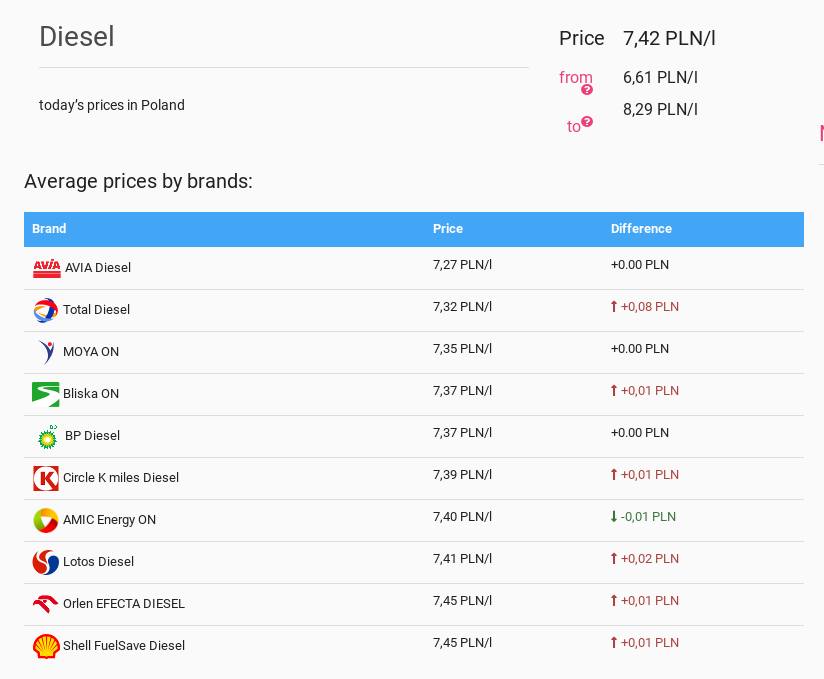 Проте пальне в Україну зараз імпортують із країн ЄС, білоруського та російського немає, отже й ціна приблизно така сама, як у них. Так, середня ціна на дизель у Польщі – 7,42 злотих – це практично 49 гривень.