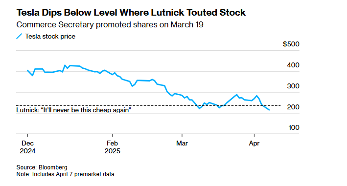 Акції Tesla Inc. продовжили падіння на початку торгів у понеділок, опустившись нижче ціни, до якої, за прогнозами міністра торгівлі Говарда Латніка, "вони більше ніколи не впадуть".