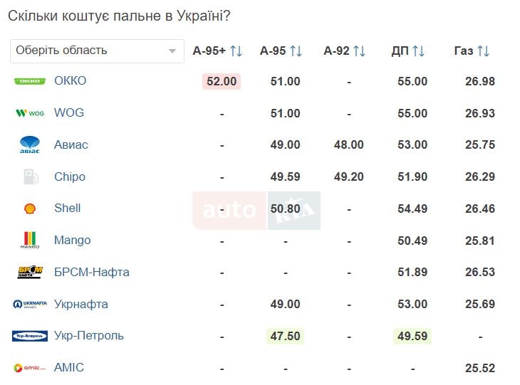 Середня ціна бензину цієї марки – 49,86 грн, найдорожче його продають мережі ОККО та WOG – 51 гривня за літр. Найдешевше його можна купити на заправках "Укр-Петроль" – 47,50 грн.