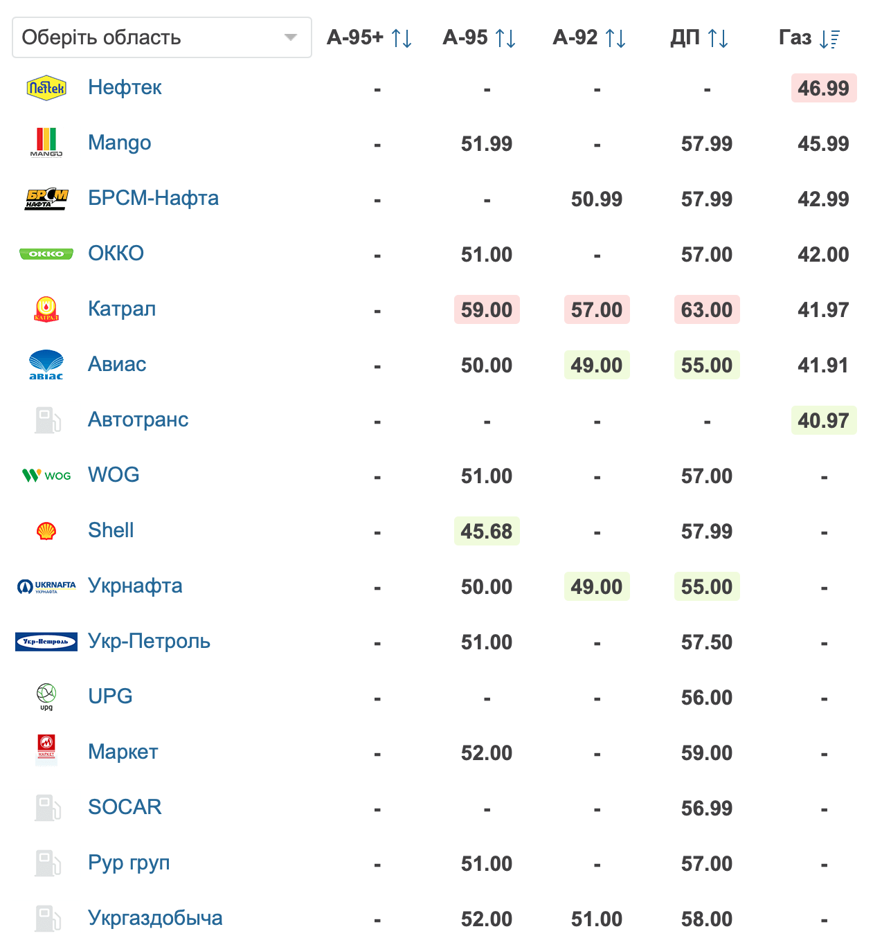 Газ для автомобілів є на шести АЗС в Україні: Автотранс, авіас, Катрал, ОККО, БРСМ-Нафта, Нефтек та Mango. Найдешевша ціна на автогаз в Автотрансі - 40,97 грн/л, також прийнятна ціна на Авіасі та Катралі - по 41,91 та 41,97 грн/л відповідно. Найдорожче продають газ в Нефтеці - за 46,99 грн/л. На інших АЗС ціни від 42 до 46 грн за літр.