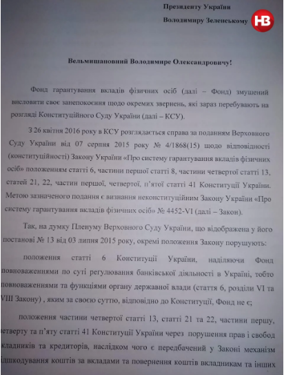 "Мета цього подання – визнання неконституційним Закону України "Про систему гарантування вкладів фізичних осіб", – йдеться у листі.