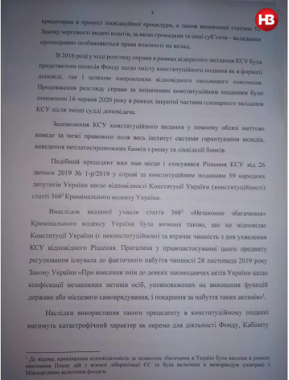 У листі стверджується, що "задоволення КСУ конституційного подання в повному обсязі миттєво виведе за межі правового поля весь інститут системи гарантування вкладів, виведення неплатоспроможних банків з ринку і ліквідації банків".