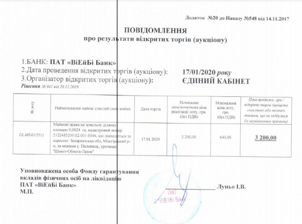 Єдиною операцією став продаж майнових прав на ділянку землі в Закарпатській області площею в 0,0024 га за 3200 грн. Про це повідомив Фонд гарантування вкладів на сайті ВАТ "ВіЕйБі Банк"