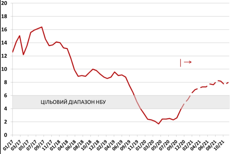 Експерти очікують, що зростання індексу споживчих цін наблизиться до середини цільового діапазону НБУ (4-6%) у грудні 2020 прискорення інфляції не завершиться, і до весни 2021 ймовірний вихід за межі цільового діапазону до 7%. Середньорічний показник споживчої інфляції за підсумками 2021 становитиме 7,3%, що майже втричі перевищить очікуваний показник середньорічної інфляції у 2020 (2,7%).