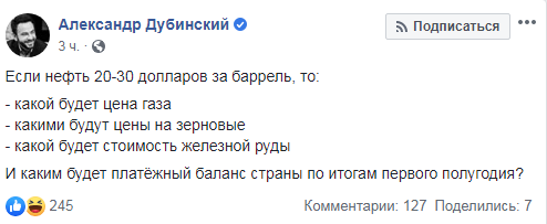 За його припущеннями, через нафту 20-30 доларів за барель невідомо, якою у підсумку буде ціна на газ. Також відкриті питання щодо ціни на зернові та залізну руду.