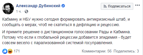 "І прийміть рішення про дистанційне голосуванні Ради і Кабміну. Тому що якщо до глобальної рецесії додасться епідемія - буде зовсім весело з паралізованою системою держуправління", - заявив Олександр Дубинський.