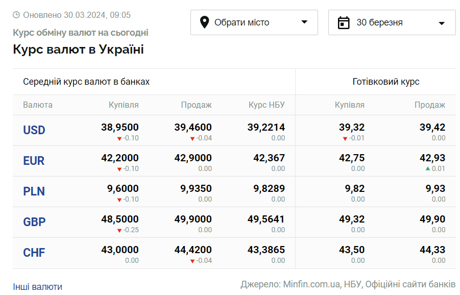Без змін залишилися середній курс продажу євро в банках та готівковий курс купівлі європейської валюти - 42,9 та 42,75 гривень відповідно. Портал "Мінфін" окремо уточнює, що усі дані, наведені в матеріалі, оновлено станом на 9:05 30 березня.