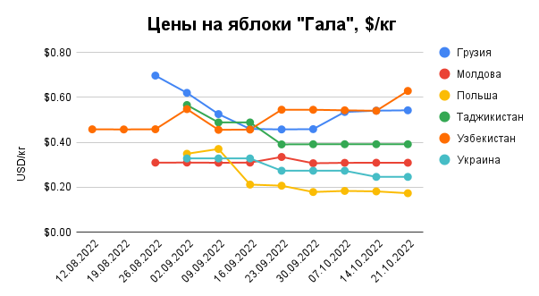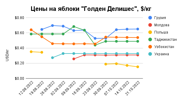 На українському ринку ціни на яблука різних сортів тримаються майже на рівні попередніх тижнів, тому в середньому становлять від 0,22 доларів/кг до 0,36 доларів/кг.