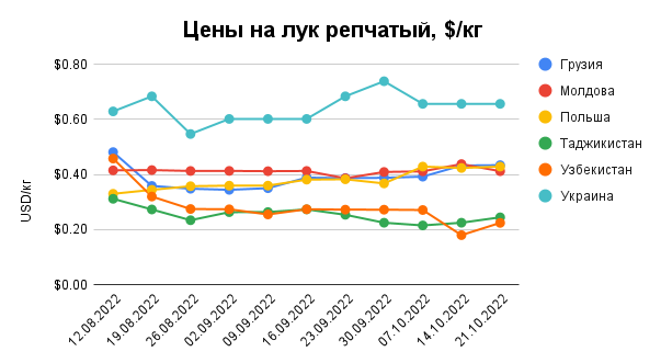 Ріпчаста цибуля на українському ринку продовжує дивувати своєю вартістю, яка зараз у середньому становить 0,66 доларів/кг, тоді як в інших країнах її ціна коливається в межах 0,41-0,43 долари/кг.