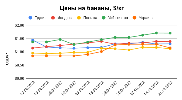 В Україні зменшилися ціни на банани до 1,12-1,15 доларів/кг, однак це все одно значно дорожче, ніж рік тому. Це наслідки логістичної кризи й зниження виробництва бананів в Еквадорі, а також девальвації гривні.